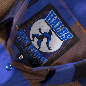 Buffalo plaid just got wrecked and rebuilt the Hales Legendary Flannels way. The Men’s Bad Moon Flannel isn’t your grandpa’s two-tone check — we dropped a four-color scheme of cobalt blue, brown, and black that hits like a full moon over the mountains. Picture it: moonlight flashing, a silhouette howling, engines firing, tires smoking. That’s the vibe stitched into this shirt. Throw it on when it’s time to hit the throttle and raise hell. Limited Edition — once this moon sets, it’s gone forever.
