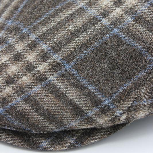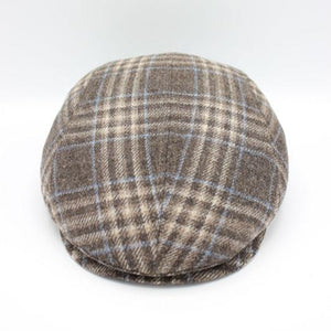 The Beige Plaid Flat Cap is a great 100% Lana wool cap made of a medium brown / beige background with white and blue check lines overlayed on top of it.