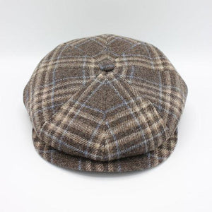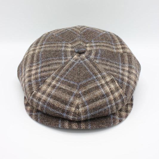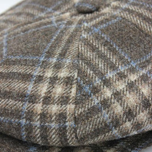 The Beige Plaid Pub Cap is a great 100% Lana wool cap made of a medium brown / beige background with white and blue check lines overlayed on top of it.