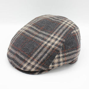 The Black Plaid Flat Cap is a great 100% Lana wool cap made of a black / dark gray background with white and orange/red check lines overlayed on top of it.
