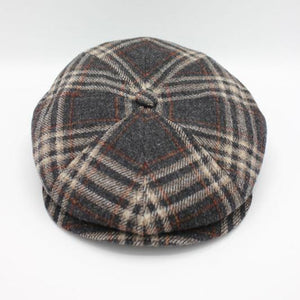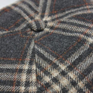 The Black Plaid Newsboy Cap is a great 100% Lana wool cap made of a black / dark gray background with white and orange/red check lines overlayed on top of it.