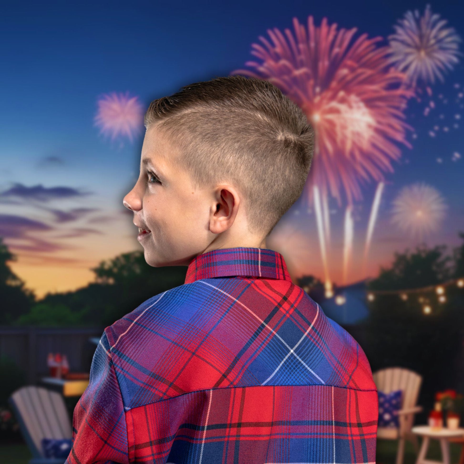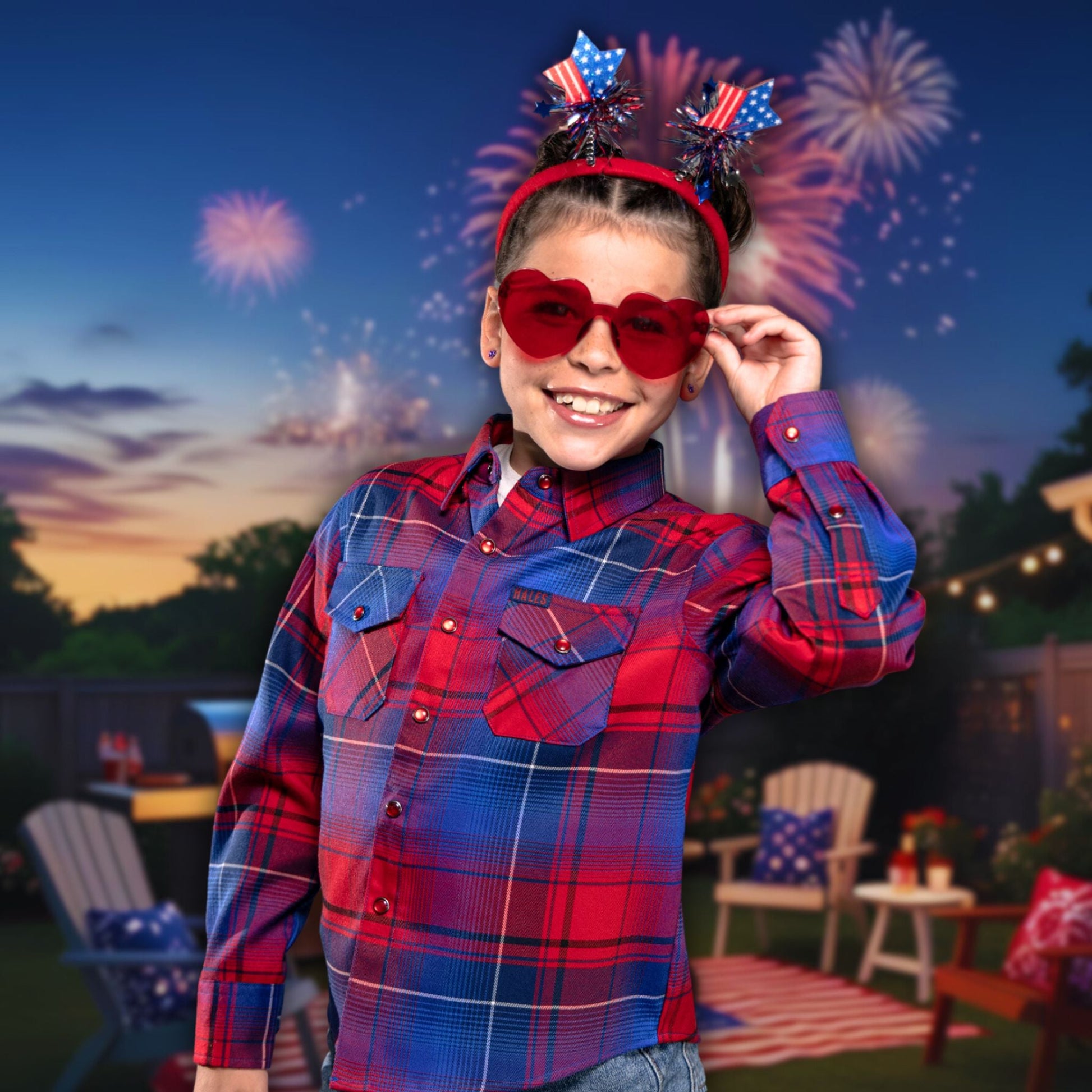 Cut from the same cloth as our full-size hitters, it features the same red, white, blue, and black plaid, decked out with patriotic red pearlized snaps and gun black trim — no shortcuts, no watered-down versions.