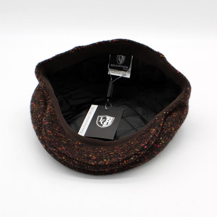 The Colorburst Herringbone Pub Cap is made from a headturning wool blend cap that has a brown base with burst of pink, red, green, an yellow flecks that from a distance makes the cap appear burgundy, but has plenty of interesting depth up close.  Flat panel Pub cap style. Quilted Liner.