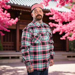 • Soft-spoken on the surface. Savage underneath. The Men’s Geisha Flannel hits in seafoam (light-jade) and cherry-blossom pink over an ominous black base—elegance with a switchblade grin. Inside, the woven neck tag pays respect with a traditional geisha—artist, host, master of the room. Outside, the hangtag/sticker flips the script with a contemporary, tattooed geisha—the spark that lit this colorway in the first place: picture a seafoam kimono slipping off the shoulder, a full dragon back piece catching the light, and sakura drifting in the dark.