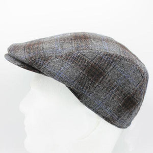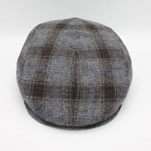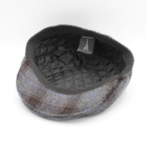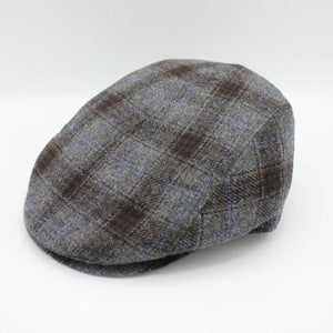 The Gray Plaid Flat Cap is a great 100% Lana wool cap made of a medium gray and brown background with black and blue check lines overlayed on top of it.