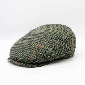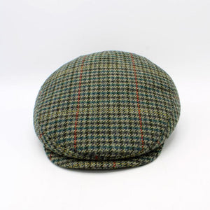 The Holiday Houndstooth is a single panel flat cap by Hologramme Paris flat cap in a Houndstooth in various shades of green with red, yellow, and gray mixed in wool blend that is both soft and warm.  Quilted Liner.