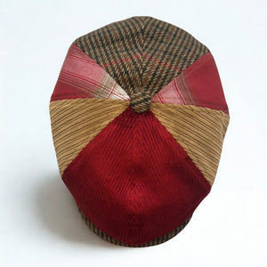 The Huckleberry Patchwork Newsboy stitches together a bold mix of textures — cardinal and tan corduroy, rich plaid, and rugged brown tweed — creating a cap with more character than a saloon full of gunslingers.