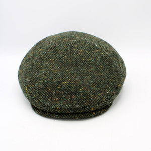 The Irish Green Herringbone is a wool flat cap made by Hologramme Paris in a nice darker green tweed with Donegal Tweed Style flecks of yellow, white, and orange throughout.  Made from a nice wool blend with just enough cotton to keep it soft and warm.  Quilted Liner.  Also comes in an 8 panel newsboy shape!