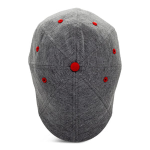Color: Grey with red button, red eyelets, and red brim with red inside fabric featuring the Jake logo