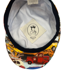 Hit the road in style with the Joyride Flat Cap by City Sport — a playful tribute to vintage car culture. Made in Belgium from 100% cotton, this slim-fit flat cap features a retro print of VW buses, classic cars, and trucks, perfect for car enthusiasts and lovers of nostalgic style.