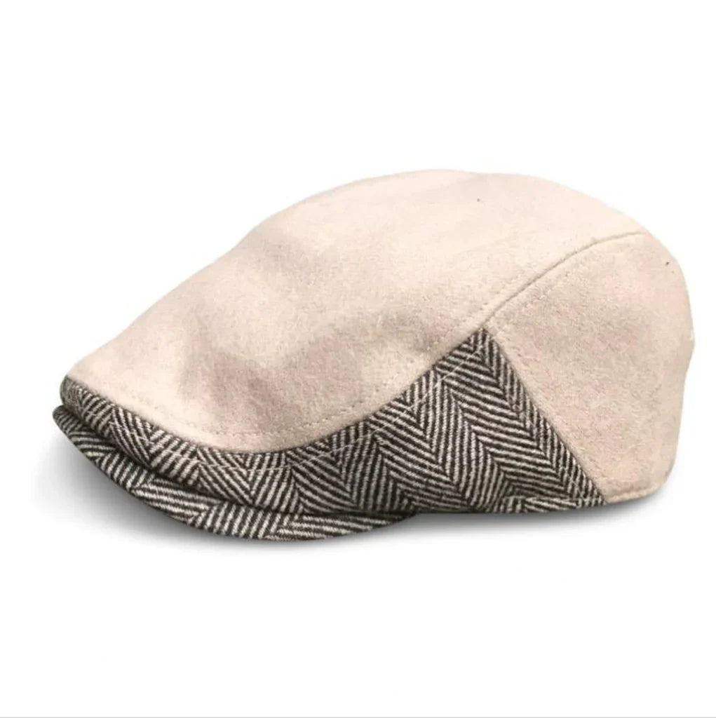 Wool traditional style scally cap with an accent of herringbone on the side.