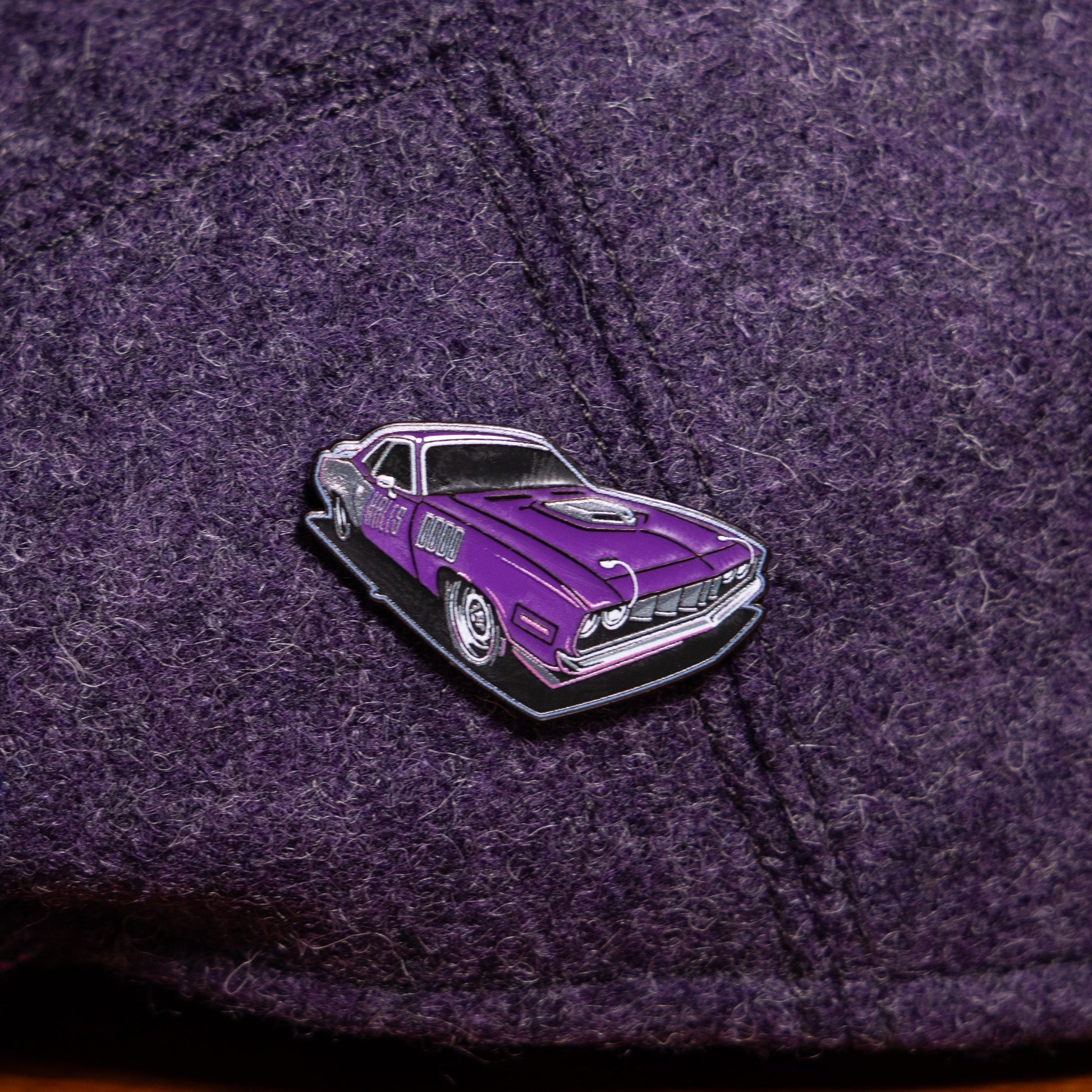 The Live Wire Enamel Cap Pin is a collaborative piece between Funky Brims and Hales Speed Shop, inspired by raw confidence, late nights, and a plum-crazy purple ’Cuda that turns heads without trying.