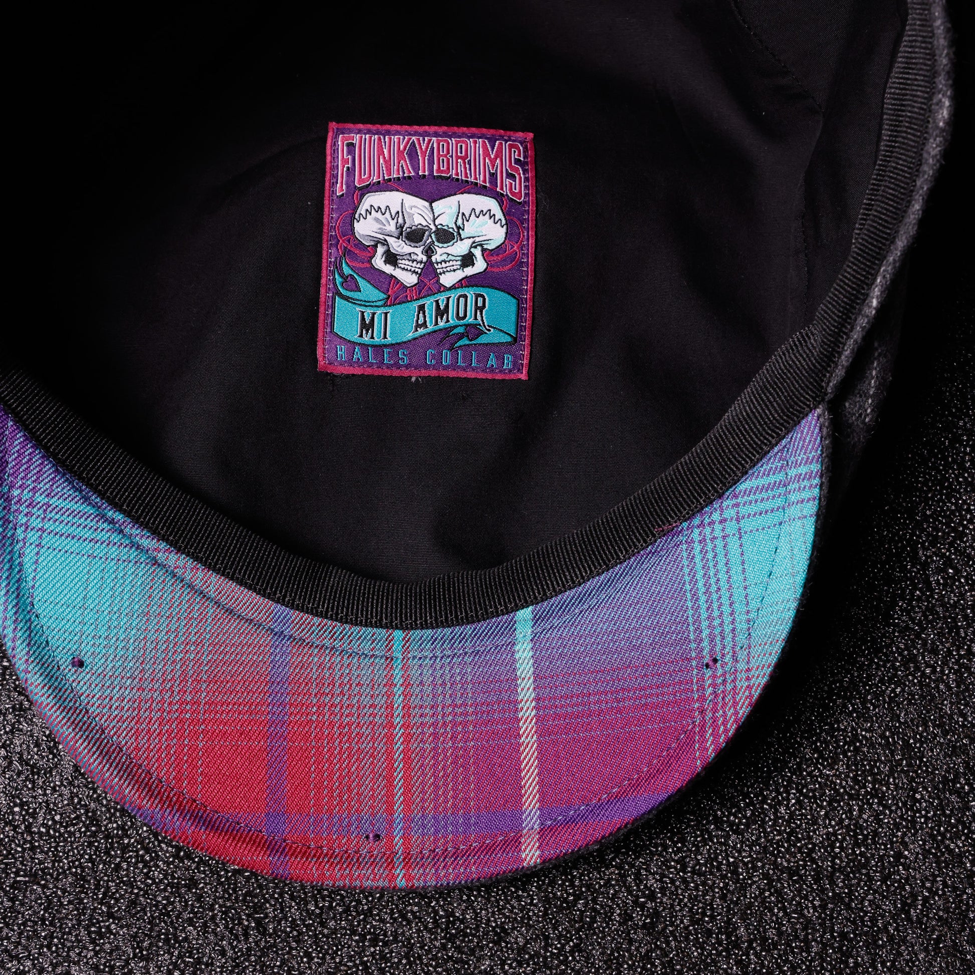 Clean on top, wild underneath. The Mi Amor Grey Pinstripe Flat Cap keeps it classic up front with smooth grey pinstripes, then flips the script with Mi Amor plaid under the brim for that unexpected pop when you tip it.