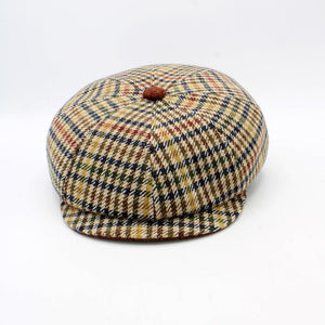 The NewsHound is a fall and winter weight wool cap in a multicolored plaid houndstooth pattern over a beige background.  It is an Italian wool blend eight panel newsboy cap, expertly tailored in Italy!  Quilted liner for the cooler days!