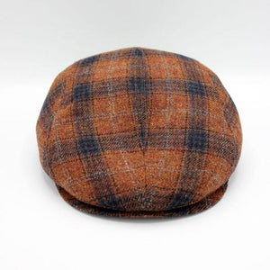 The Orange Plaid Flat Cap is a great 100% Lana wool cap made of an orange background plaid with black and dark blue check lines overlayed on top of it.