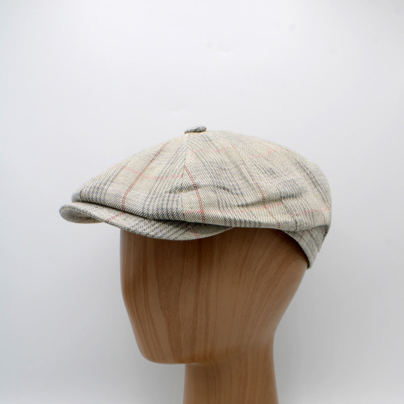 Stay cool and look sharp with the "Summer Sand Shelby" by Hologramme Paris—a breathable 8-panel newsboy cap made for hot weather style. This lightweight cap features a beige base with subtle gray and red plaid, crafted from Hologramme’s airiest Italian cotton-poly blend.
