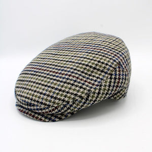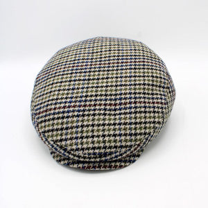 The Winter Houndstooth is a single panel flat cap by Hologramme Paris flat cap in a Houndstooth with a beige background color and houndstooth pattern with various shades of green, red, blue, and black mixed in wool blend that is both soft and warm.  Quilted Liner.